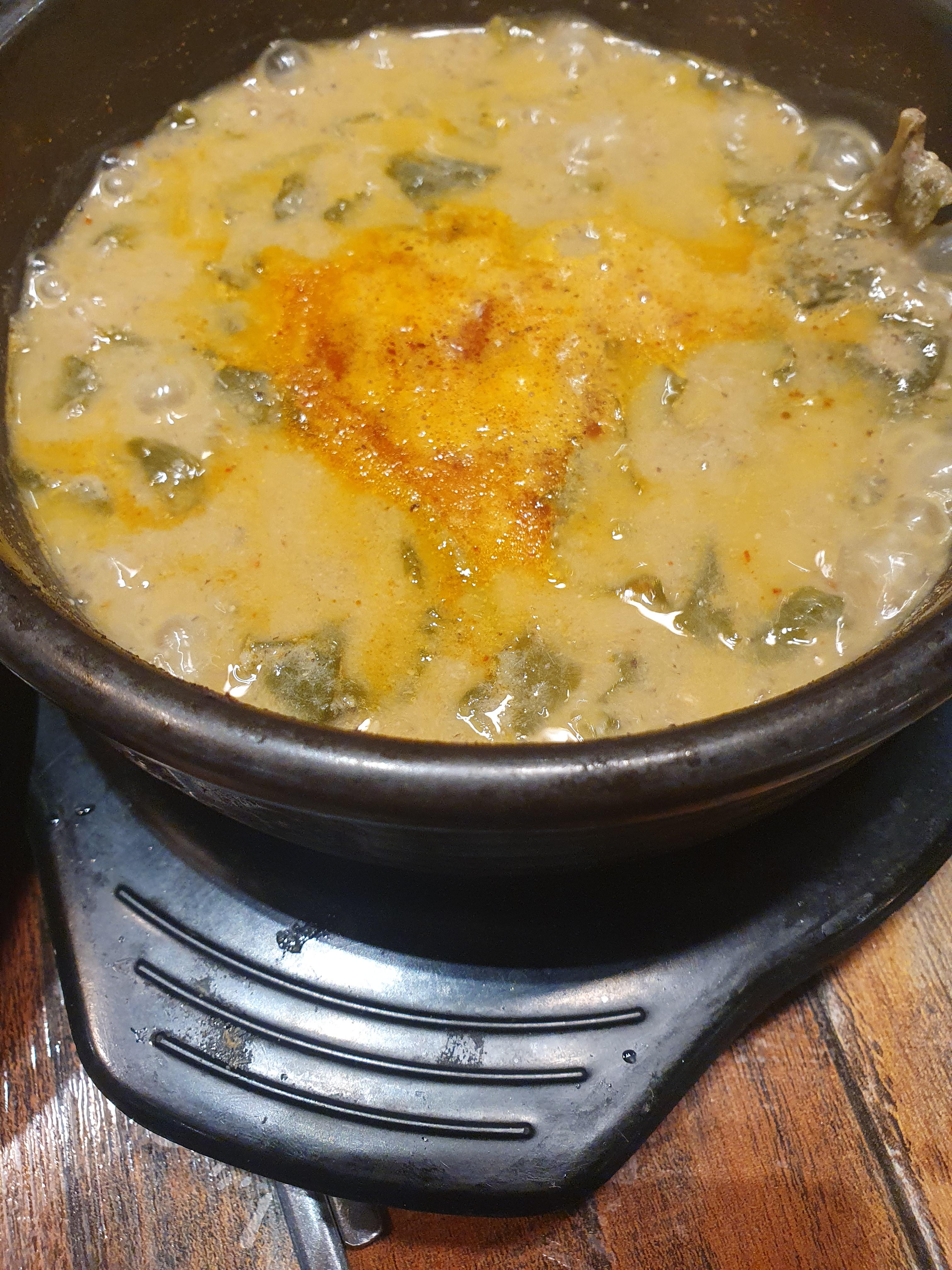 사실 송담 추어탕 메뉴 가격이 12000원이라고 해도 조금 수긍할 수 있는 부분이 있다. 왜냐하면 기본적으로 숭늉을 먹을 수 있도록 나오기 때문이다. 저렇게  솥밥이 (갑자기 이름 생각이 안난다 ㅠㅠ) 나오면 밥을 덜어내고 육수를 넣어 식사 후 따끈따끈한 숭늉으로 먹을 수 있다. 아직 날씨가 추운데 든든하게 한 끼 채우기로 딱 좋다.
