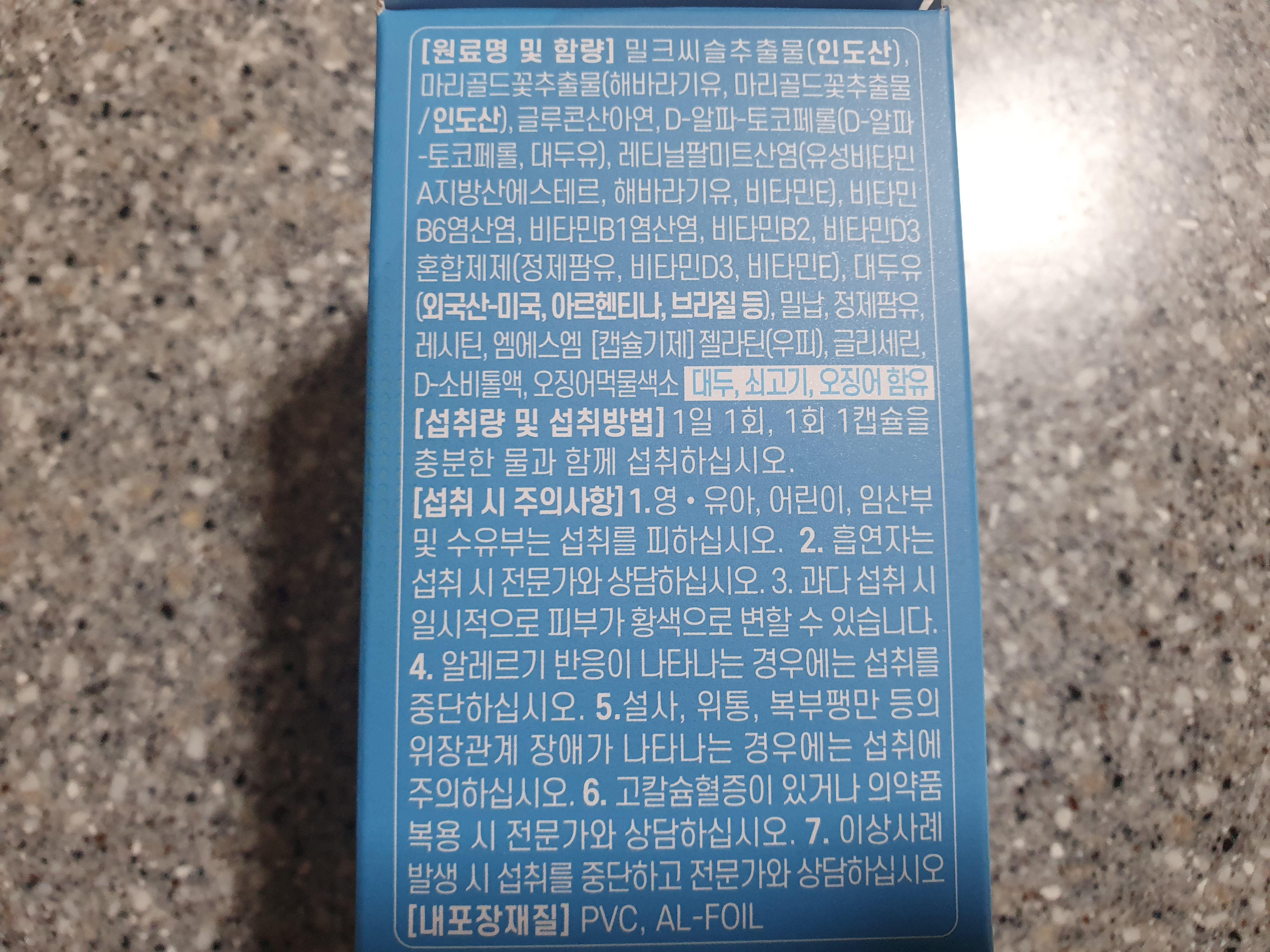 눈에 좋은 영양제라고 해서 눈 건강만 챙길 필요가 있을까요? 요즘에는 이것저것 다 집어 넣은 영양제가 많습니다. 이 제품은 눈과 간까지 챙길 수 있습니다. 같은 제품을 찾는 것은 어려울 수 있지만 참고하셔서 루테인 고를 때 다른 기능성 성분이 있는지 같이 보면 더 좋겠죠? 성분에 있는 밀크씨슬추출물은 간 건강에 좋은 성분입니다.
