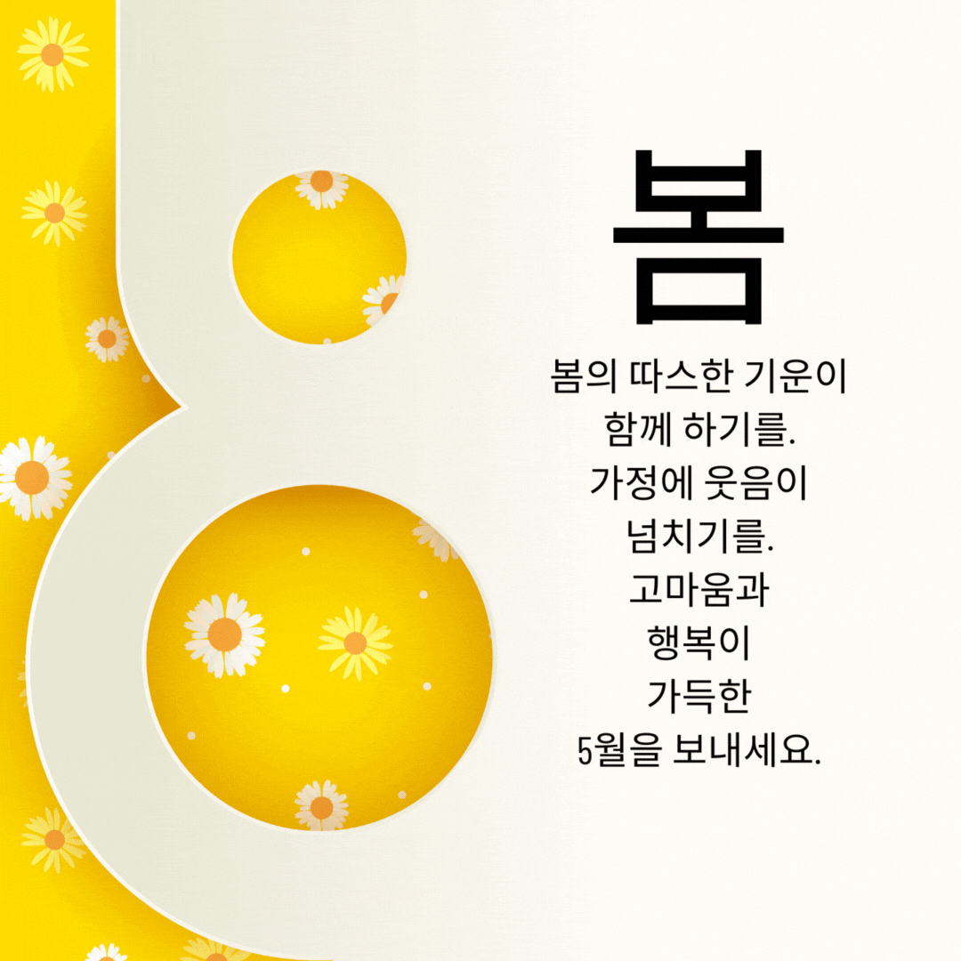 5월은 봄의 마지막 날입니다. 5월 지나면 또 많이 더워지겠죠? 봄의 마지막 5월에는 가족, 주변 지인분들과 함께 더 뜻깊고 행복이 가득한 한 달을 보내세요~
