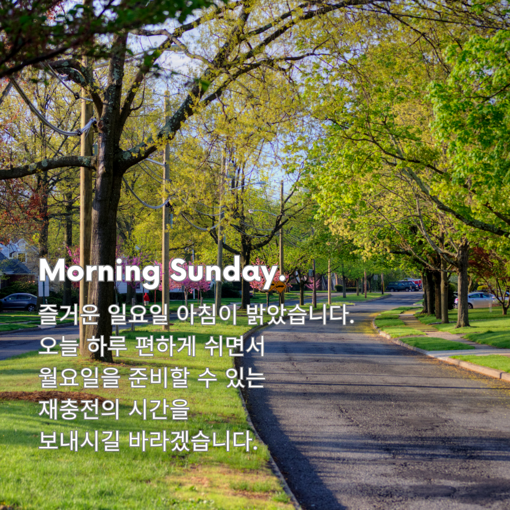 2. 즐거운 일요일 아침이 밝았습니다. 오늘 하루 편하게 쉬면서 월요일을 준비할 수 있는 재충전의 시간을 보내시길 바라겠습니다.